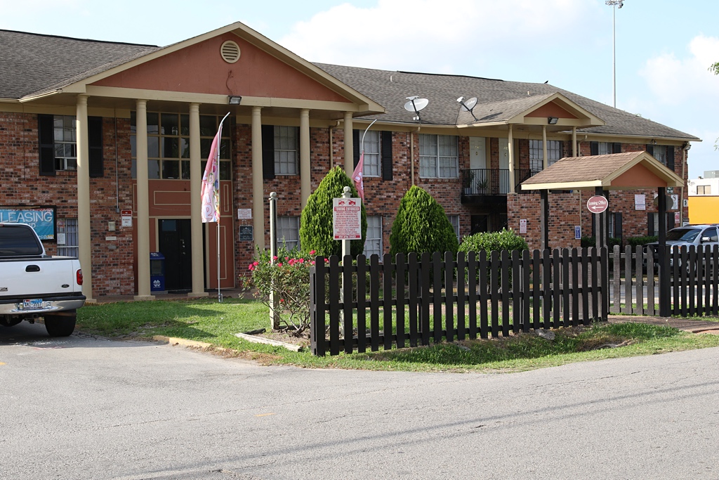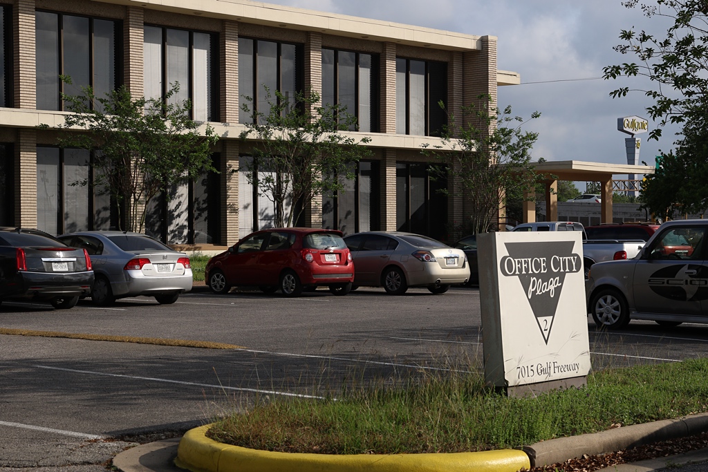 The Flight Crew Operations Division was located in two office blocks described as "two dumpy, early 60's low rise office buildings." These two appear to be the Office City buildings on Office City Plaza. The visible Gulfgate Mall sign in the background, across the freeway, highlights the proximity of the two sites.